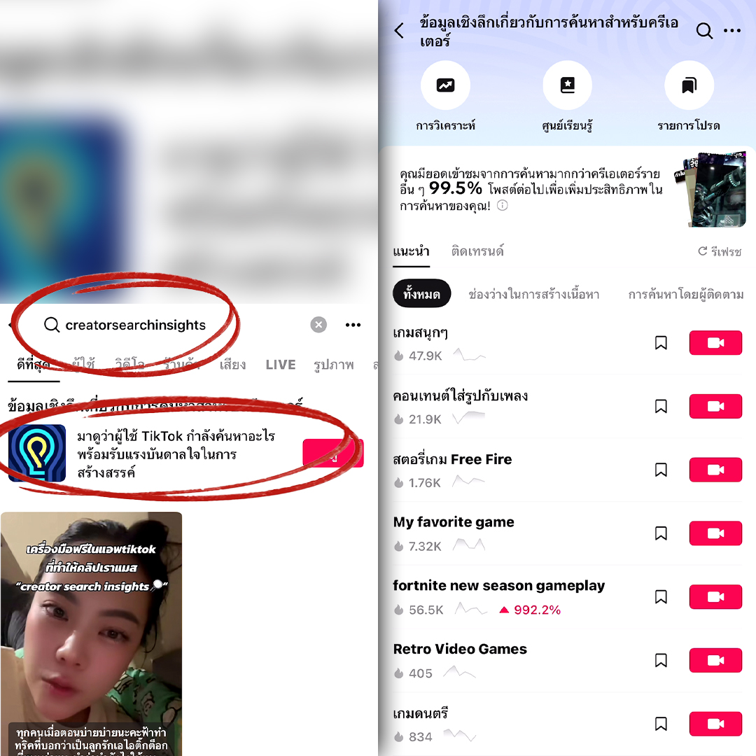 วิธีการนั้นให้ผู้ใช้งานพิมพ์ในช่องค้นหาว่า Creator Search Insights จากนั้นก็จะมีไอคอนขึ้นมา ก็ให้กดเข้าไป โดยฟีเจอร์นี้จะเป็นเหมือนอีกเครื่องมือหนึ่งที่ช่วยให้ฝั่งครีเอเตอร์สามารถทำคอนเทนต์แบบรู้ และเข้าใจความสนใจของผู้ชมได้มากขึ้น เพราะจะได้เห็นว่า ณ ตอนนี้ผู้คนค้นหาอะไรกันอยู่