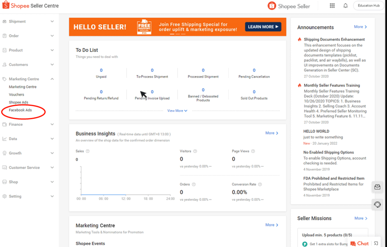 Go to Shopee seller center > Marketing Center > Facebook Ads. Please note that this oprion is not for every Shopee seller, you can contact Shopee team to enable this feature if you want to use.