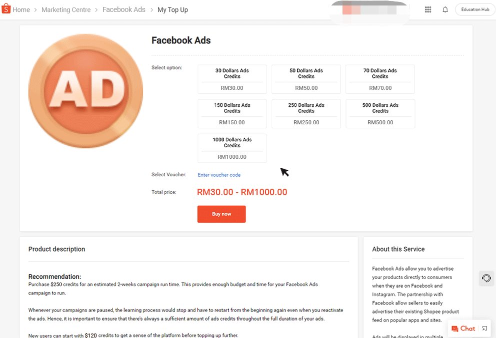 After creating a Facebook ads account, you can process to top up your ads credit. After you click Top Up, you can select your preferred amount option and click Buy Now. Then you can select a payment method and Confirm it. There is a note I should remind you is that the ads credit top-up is non-refundable and it can only be used for Facebook ads, not for Shopee ads and vice versa.