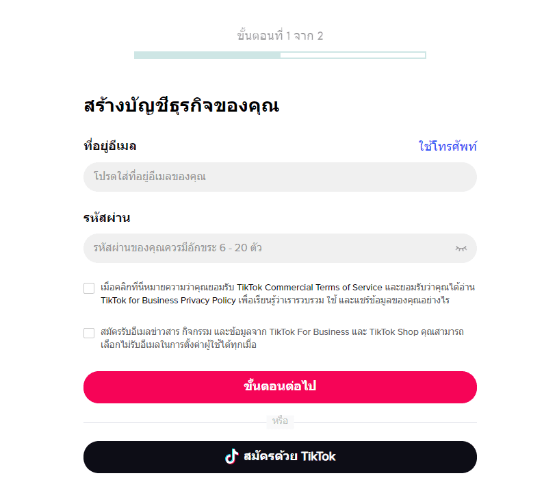 สำหรับแบรนด์ต่าง ๆ ที่มีความสนใจก็จะมีวิธีสมัคร Tiktok Creator โดยเข้าสู่ TikTok Creator Marketplace ด้วยการสร้างบัญชีโฆษณา (TikTok Ads Manager) โดยใช้ข้อมูล