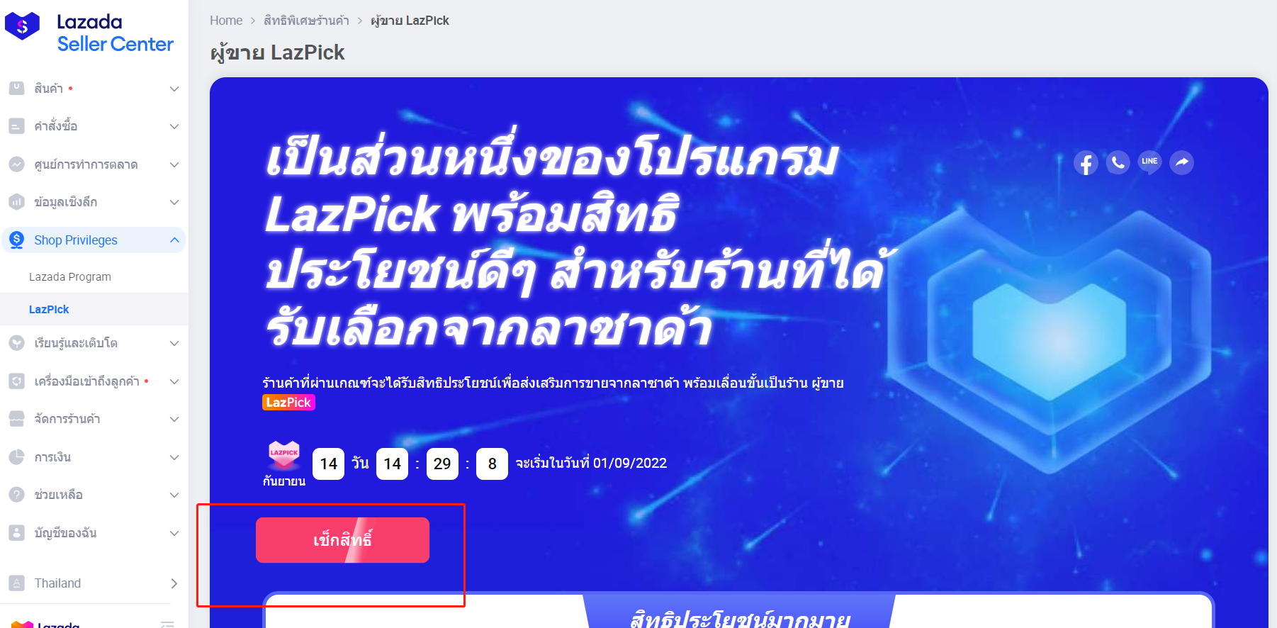 เข้าไปที่ Seller Center ของ Lazada > แท็บ Shop Privileges > LazPick