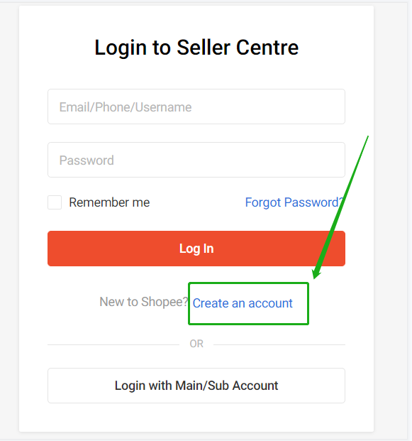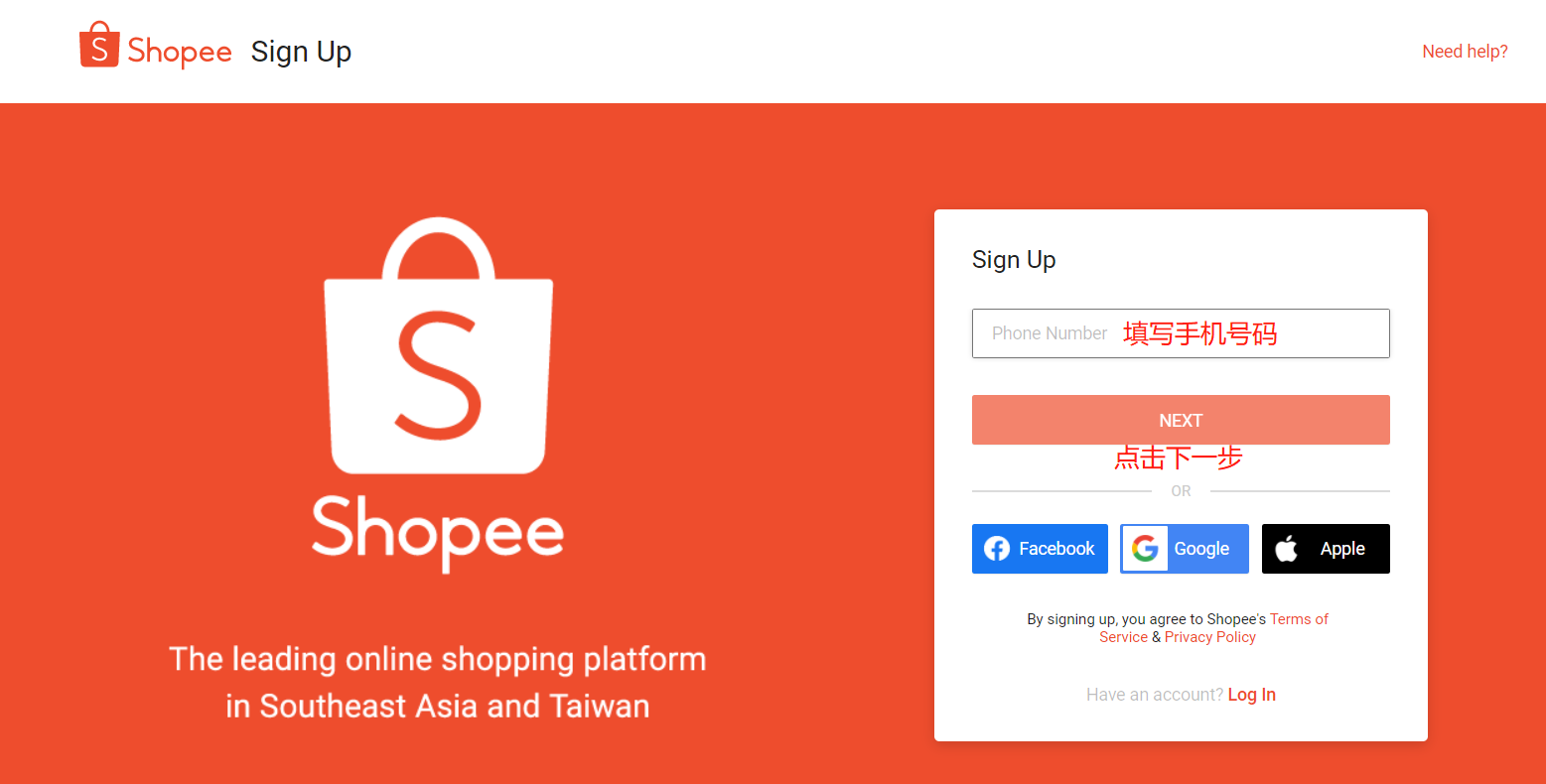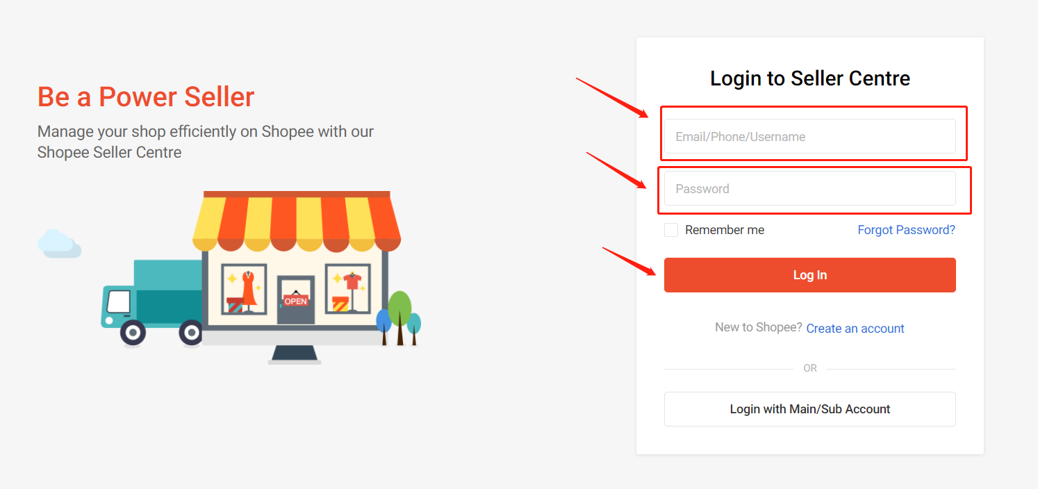 2. 注册成功后,访问Shopee卖家中心,填写您注册的手机号,邮箱或者用户名,输入密码点击登录(Log In)即可。