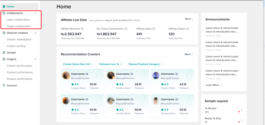 1. ตั้งค่า Open Collaboration:เปิดเผยข้อมูลสินค้าใน TikTok Product Marketplace เพื่ออำนวยความสะดวกให้ Creator เลือกสินค้าที่เหมาะสมในการโปรโมตได้ด้วยตัวเอง ผู้ขายเพียงแค่ตรวจสอบคุณสมบัติของ Creator และส่งตัวอย่างสินค้าให้เท่านั้น