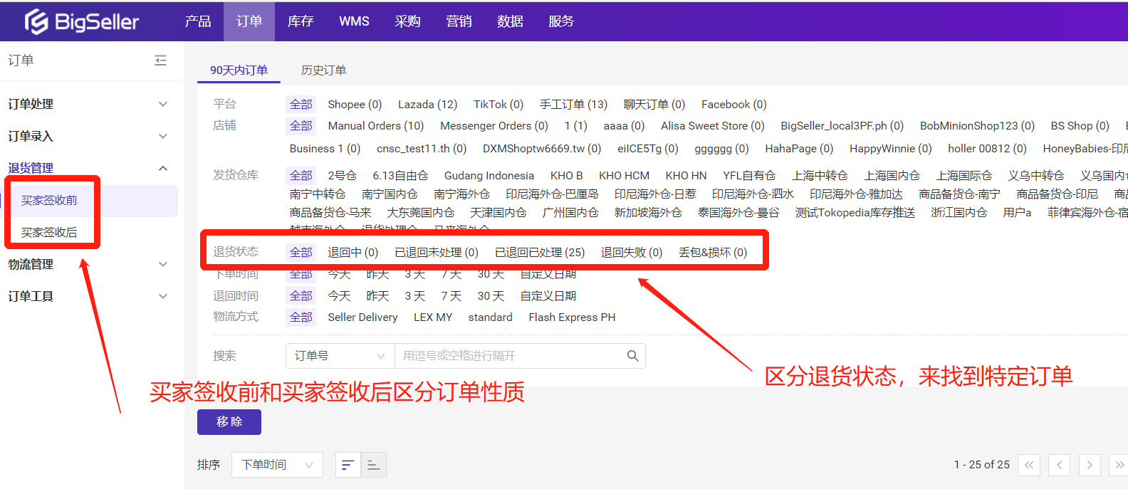 不管是那种,对卖家来说,都是增加了买家退货的可能性,BigSeller的退货管理功能,就能帮助卖家朋友监控退货、退款订单,处理买家退货申请、退货订单一键入库。