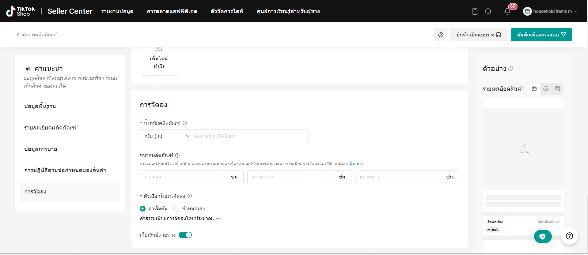 1. กรอกน้ำหนักและขนาดของสินค้า ตรวจสอบให้แน่ใจว่าน้ำหนักกล่องและขนาดถูกต้องเนื่องจากจะใช้ในการคำนวณค่าธรรมเนียมจัดส่งและวีธีการจัดส่ง