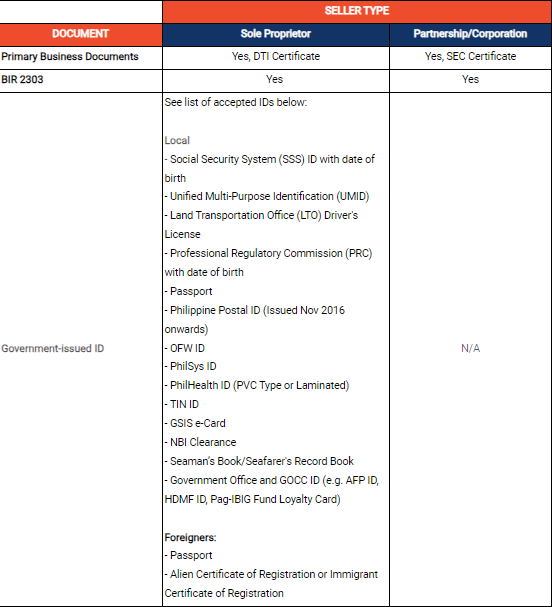 | Vapor and Heated Tobacco | 1. DTI/SEC/CDA** 2. BIR 2303** 3. Mayor's Permit - Line of Business should include Vapes ⚠️ Note - These documents require to be posted on your shop homepage. - ** - Submit these via the Business Information page |
