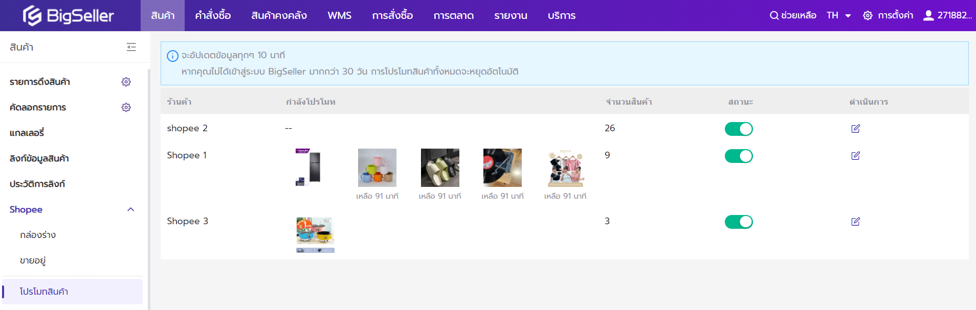สำหรับการโปรโมทสินค้า การใช้เครื่องมือต่างๆ สามารถเพิ่มประสิทธิภาพได้อย่างมาก ฟังก์ชันการโปรโมทสินค้า Shopee ของ BigSeller ช่วยให้ผู้ขายสามารถกระตุ้นการมองเห็นสินค้าของท่านได้ชั่วคราว การทำเช่นนี้ไม่เพียงแต่เพิ่มการมองเห็นของสินค้า แต่ยังช่วยปรากฏให้เห็นเป็นลำดับต้นๆ ในรายการที่เกี่ยวข้องและเพิ่มอัตราการคลิกของลูกค้า ด้วยฟังก์ชันนี้ ผู้ขายสามารถโปรโมทสินค้าที่ขายดีหรือสินค้าใหม่ได้อย่างมีประสิทธิภาพ ทำให้ลูกค้าเป้าหมายเห็นสินค้ามากขึ้น และระบบ BigSeller จะช่วยโปรโมทสินค้าให้ร้านค้าโดยอัตโนมัติตลอด 24 ชั่วโมง โปรโมทสินค้า 5 รายการในทุกๆ 4 ชั่วโมง โดยไม่ต้องเข้่สู่ระบบ Shopee Seller Center เพื่อกดโปรโมทด้วยตนเองทุกๆ 4 ชั่วโมง เพื่อเพิ่มการแสดงสินค้าอย่างต่อเนื่อง ฟังก์ชันดีๆ แบบนี้อย่ารอใคร รีบมาลองใช้เลย