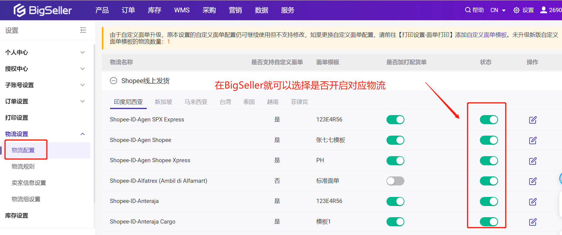 Shopee本土店授权到BigSeller以后,卖家可以在BigSeller管理物流,选择需要使用的物流方式,开启或关闭物流