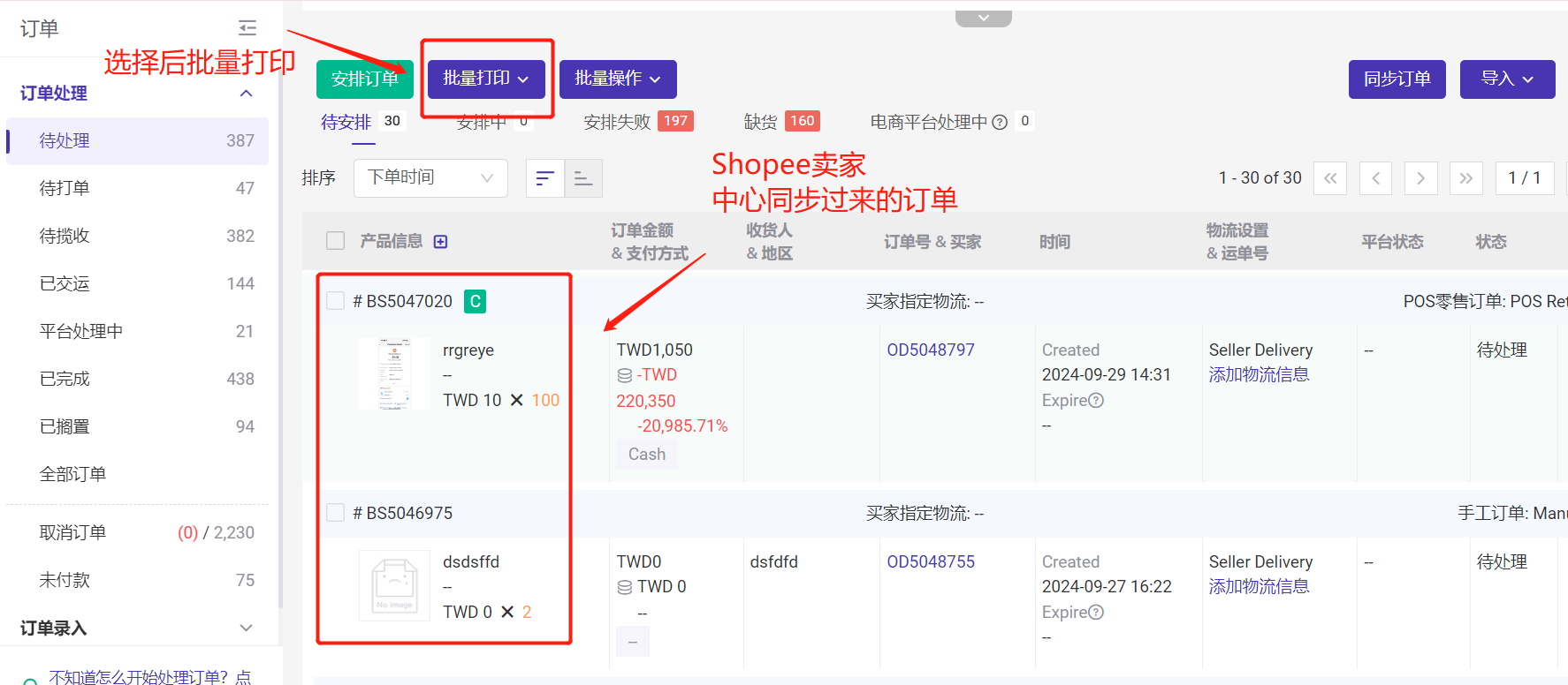 Shopee店铺出单,订单会自动同步物流、收件人、等订单详情到BigSeller,卖家可以统一批量选择,打印面单
