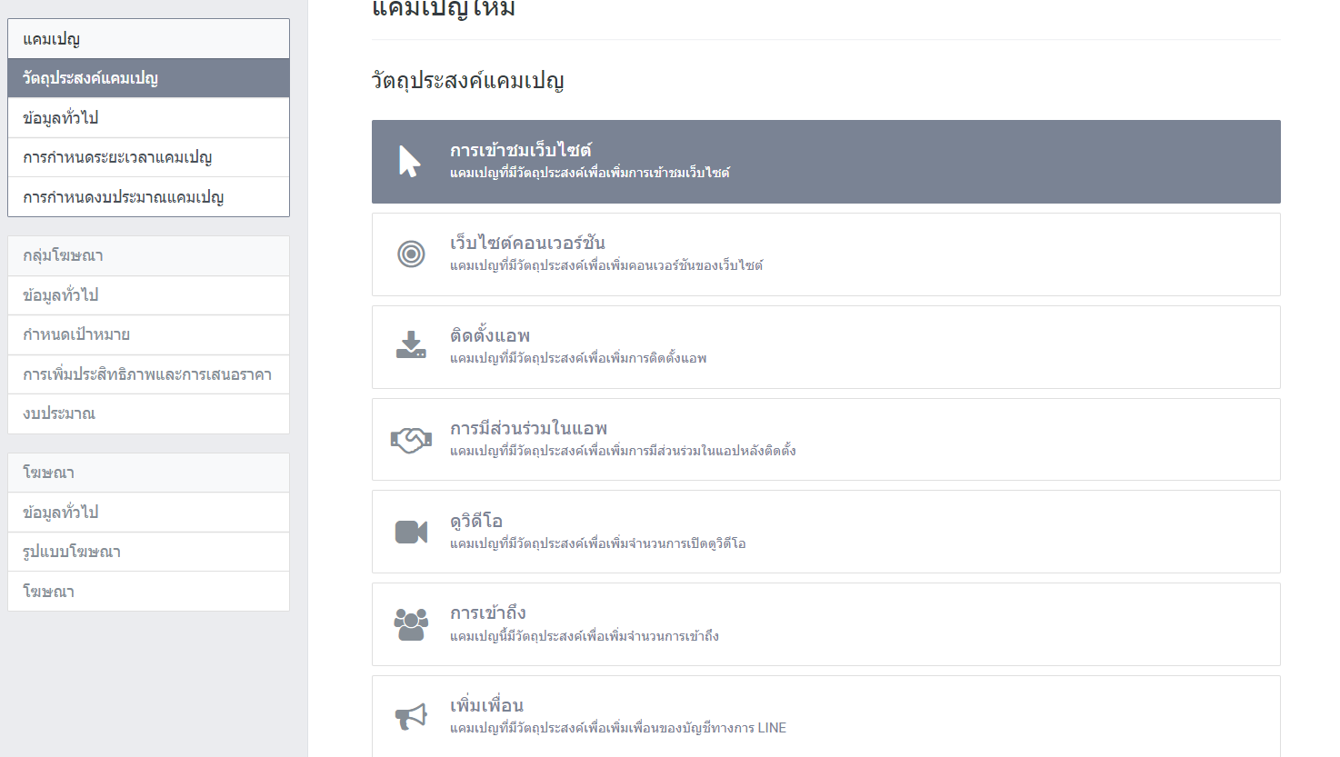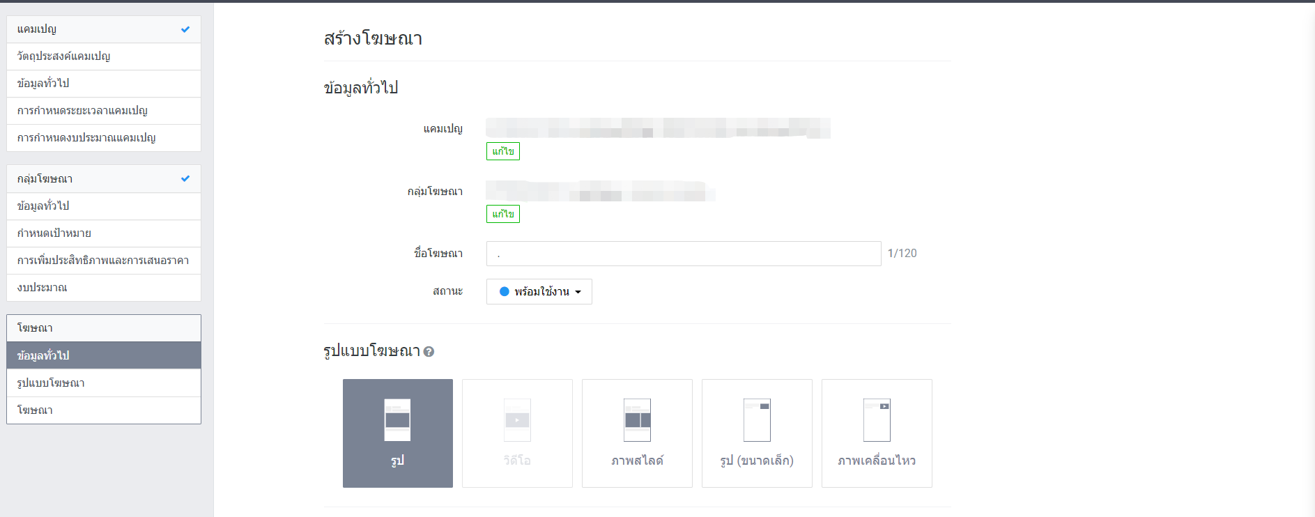 เลือกวัตถุประสงค์ / กรอกข้อมูลทั่วไป / กำหนดระยะเวลาแคมเปญ / กำหนดงบประมาณแคมเปญ