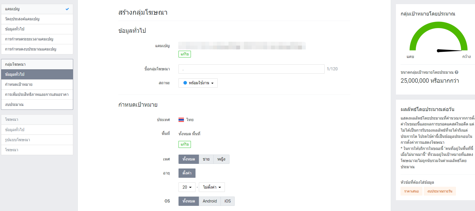 จะมีให้เลือกกลุ่มเป้าหมายหลักหรือสร้างกลุ่มเป้าด้วยตนเอง และกดหนด และตั้งค่าราคาเสนอตามที่ต้องการ