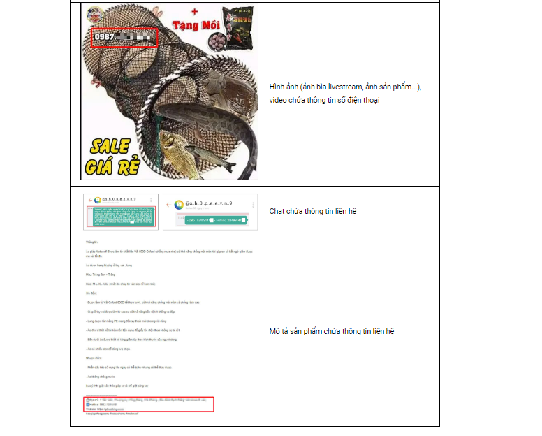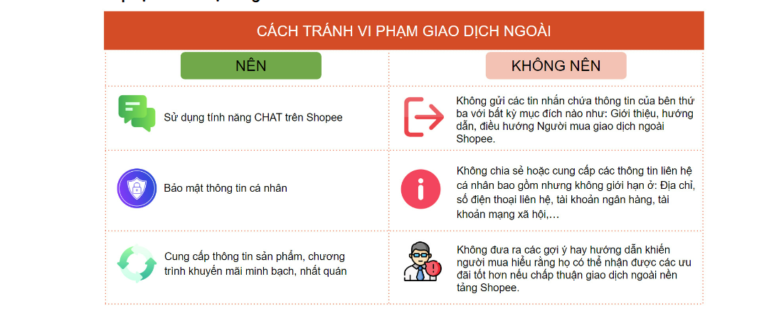 - Chia sẻ thông tin liên hệ của Người bán qua bất kỳ hình thức nào như để lại thông liên hệ bao gồm số điện thoại, địa chỉ, trang web ngoài Shopee…khi chat với Người mua, trên hình ảnh, thông tin sản phẩm, trên Livestream, Video hoặc trên ảnh trang trí shop,….