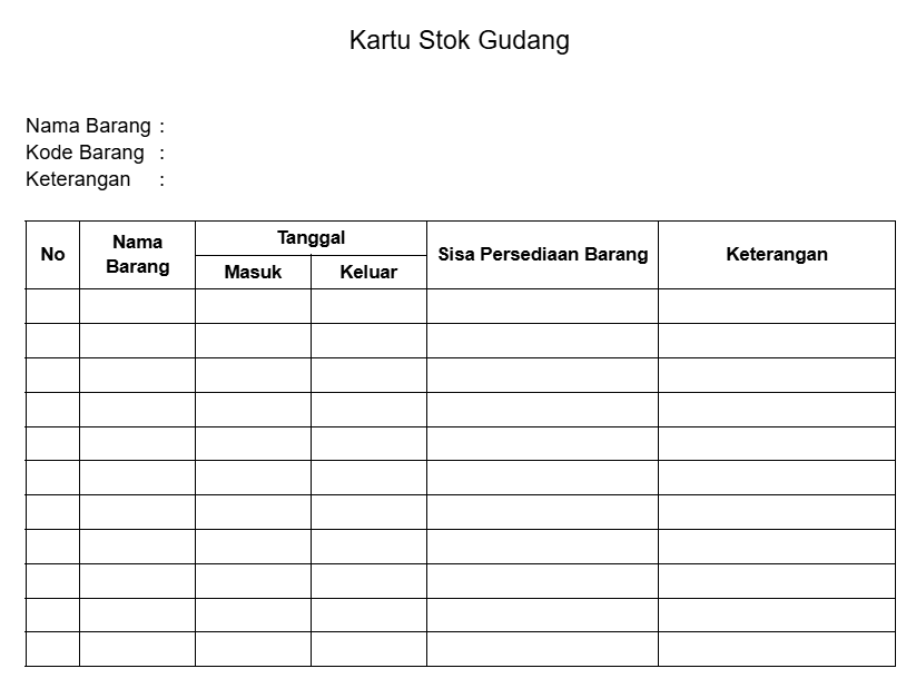 Berikut contoh kartu gudang yang umumnya digunakan untuk mencatat arus keluar dan masuk barang dari gudang: