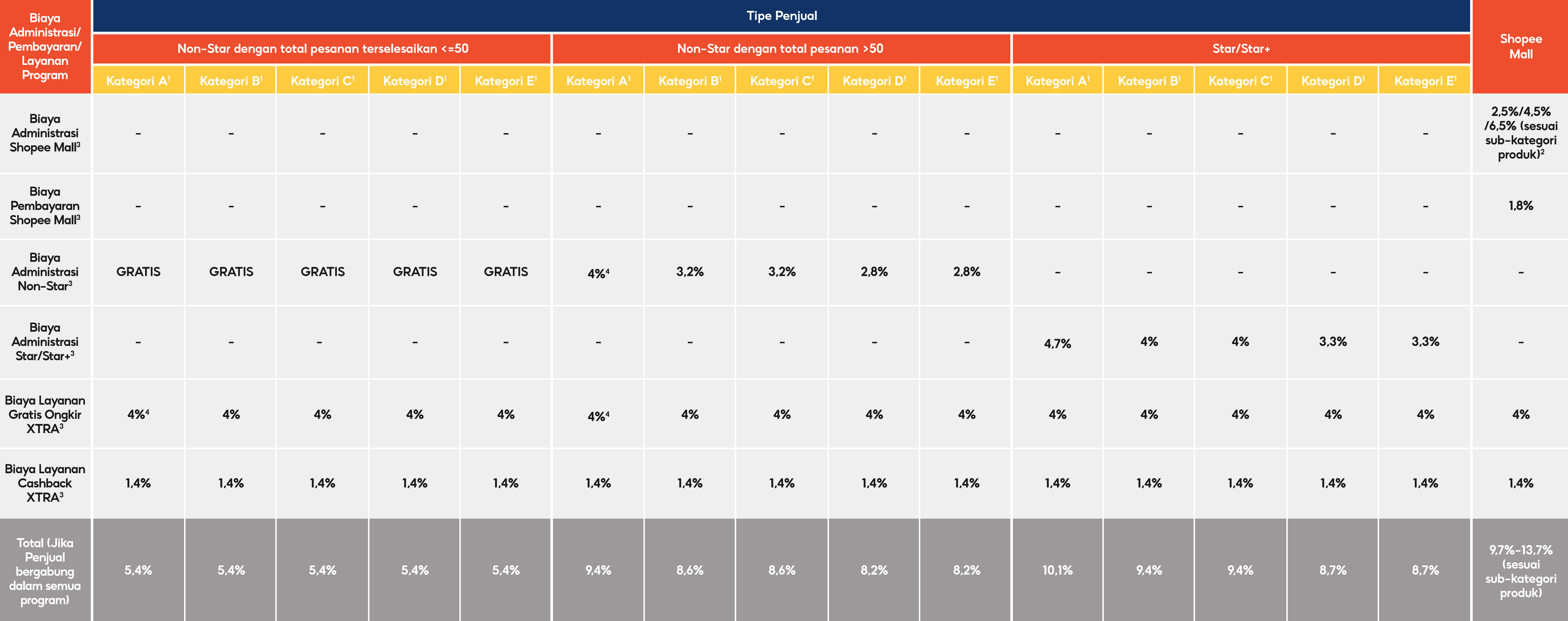 Penjual atau seller Shopee yang telah berstatus star seller atau star plus akan dikenakan biaya admin yang berbedadari seller non-star. Tetapi, biaya admin ini juga berdasarkan kategori barangnya.