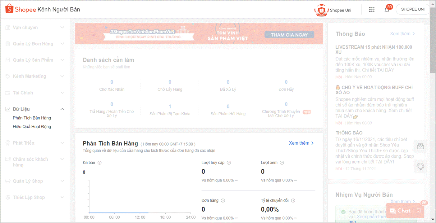 Người bán cần theo dõi hiệu suất của các sản phẩm để cải thiện doanh thu cho Shop: Vào Kênh người bán >> chọn Phân tích bán hàng >> Chọn Sản phẩm (tìm hiểu sản phẩm nào đang bán chạy và sản phẩm nào cần cải thiện)