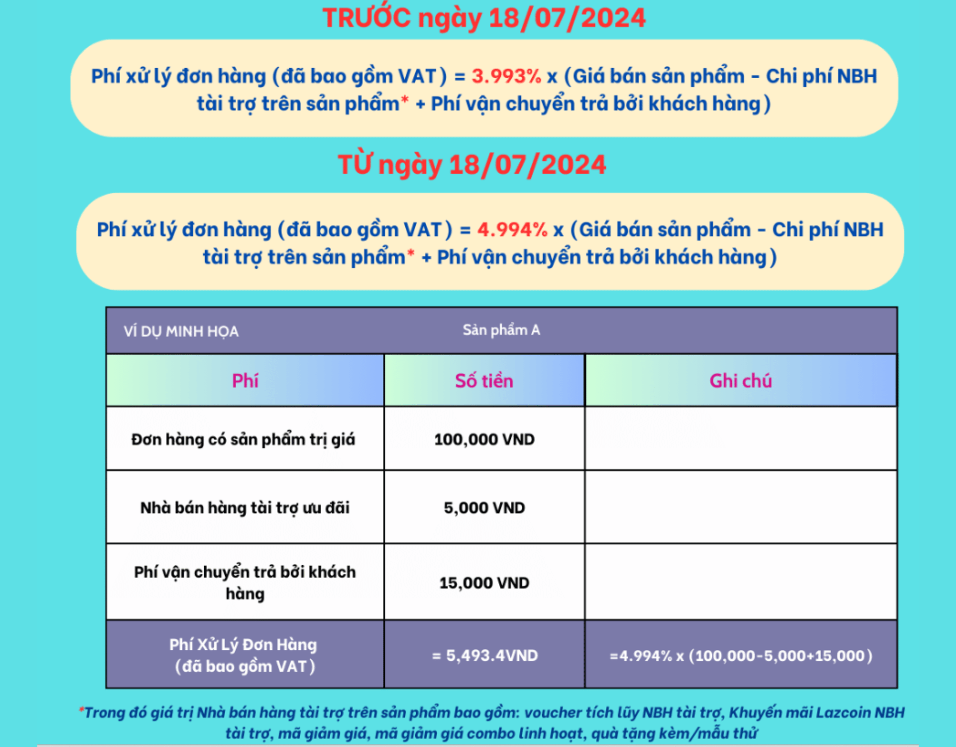 Kể từ ngày 18/07/2024, Lazada chính thức áp dụng phí xử lý đơn hàng cho mỗi đơn hàng thành công trên sàn thương mại điện tử Lazada là 4,994% (bao gồm VAT).