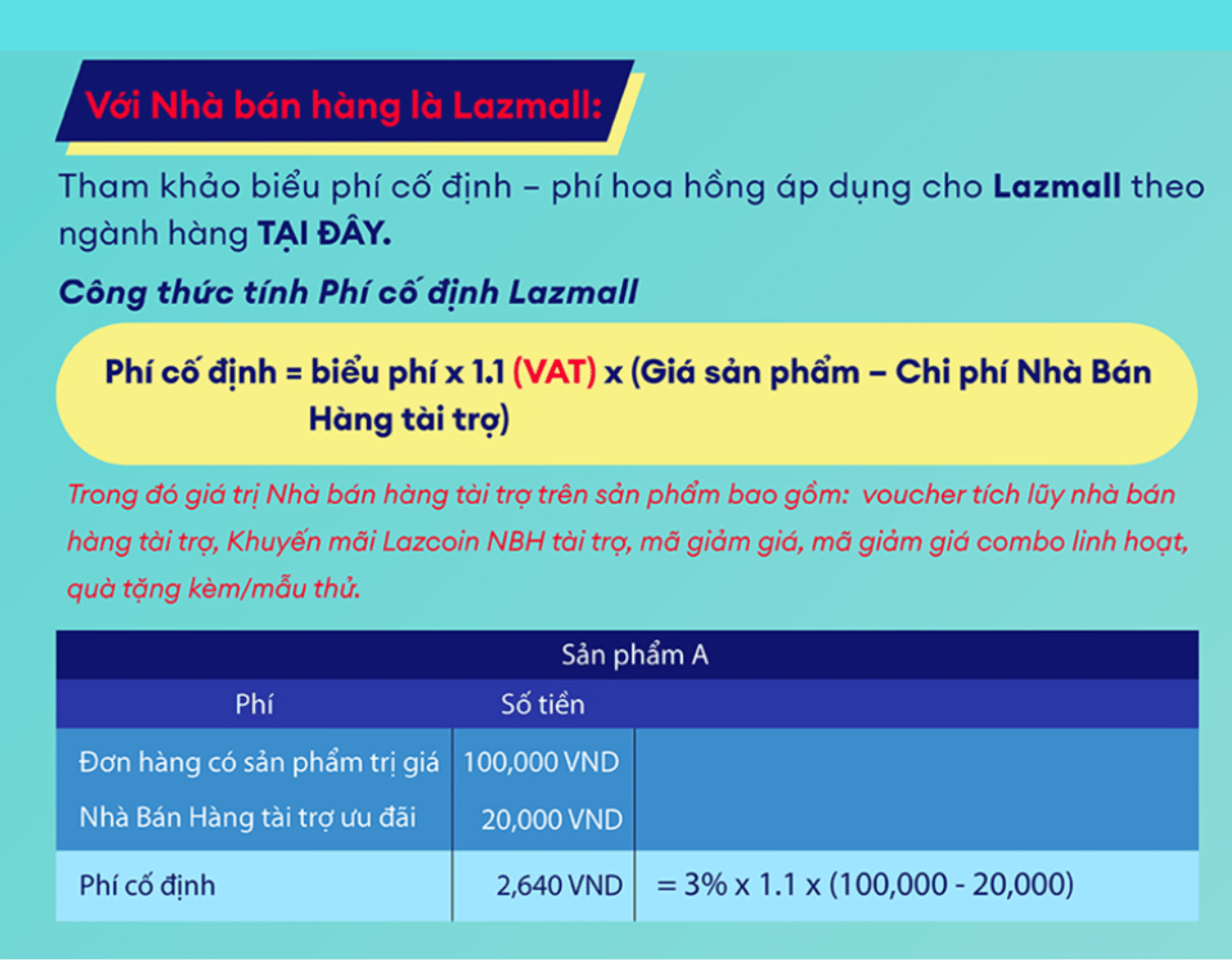 Phí cố định là phí hoa hồng cố định áp dụng cho tất cả các giao dịch bán sản phẩm, sử dụng dịch vụ của nhà bán hàng thuộc kênh phân phối LazMall, nhà bán hàng không thuộc LazMall được thực hiện giao hàng thành công trên sàn Lazada.