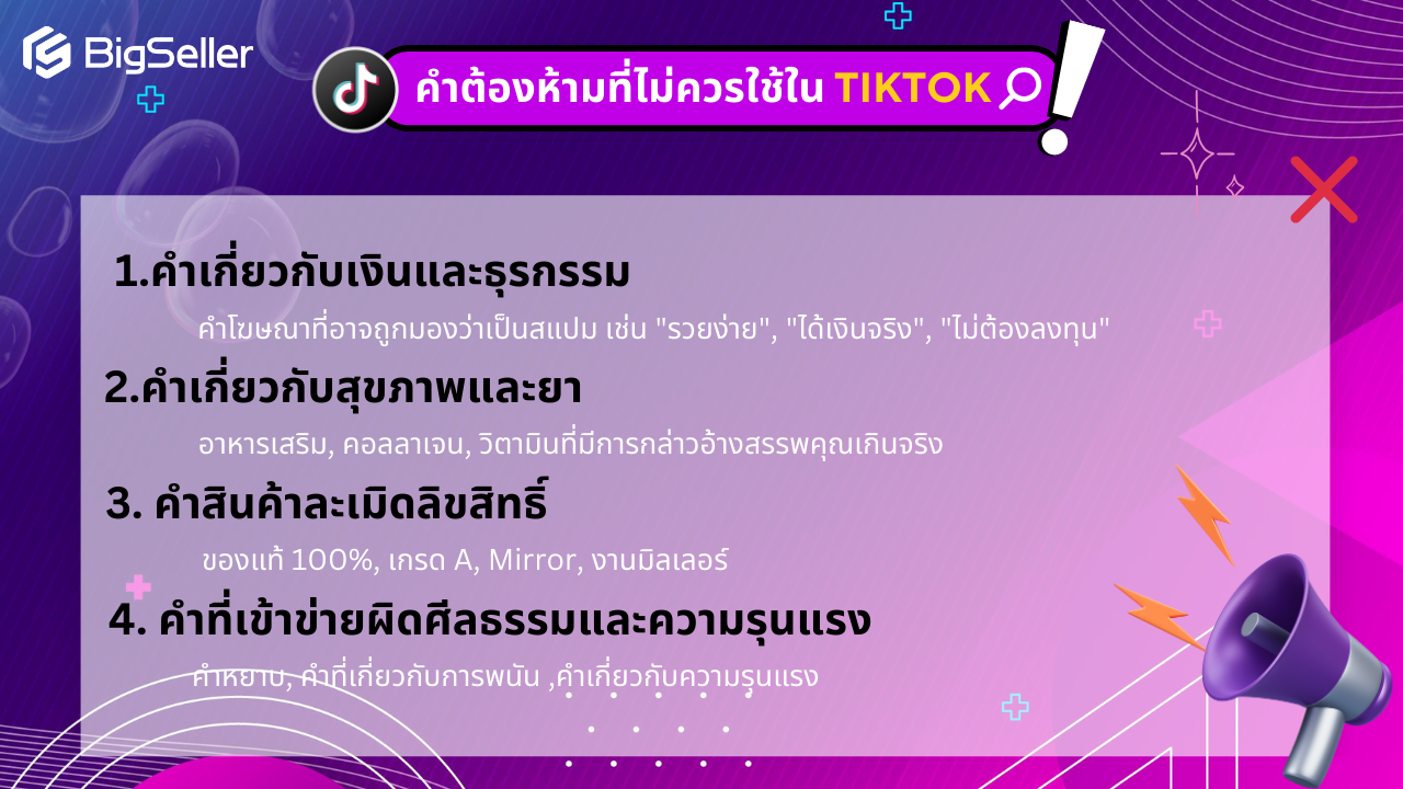 TikTok เป็นแพลตฟอร์มที่แม่ค้าออนไลน์ใช้สร้างยอดขายได้อย่างมหาศาล แต่รู้หรือไม่ว่า TikTok มีกฎที่ต้องระวัง โดยเฉพาะ "คำต้องห้าม" ที่อาจทำให้คลิปโดนลดการมองเห็น หรือแย่กว่านั้น โดนแบนแบบไม่รู้ตัว! วันนี้เรามาอัปเดตกฎใหม่ พร้อมลิสต์คำต้องห้ามที่ต้องรู้!