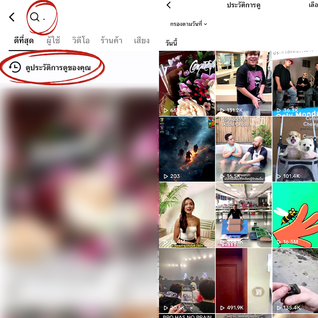 เพียงแค่พิมพ์ “.” (จุด) ในช่องค้นหา แล้วทีนี้มันก็จะขึ้นมาเป็นไอคอน “ดูประวัติการดูของคุณ” ก็ให้กดเข้าไป เพียงเท่านี้เราก็จะได้เห็นคลิปทั้งหมดที่เราได้ดูไปเมื่อ 180 วันที่ผ่านมาแล้ว