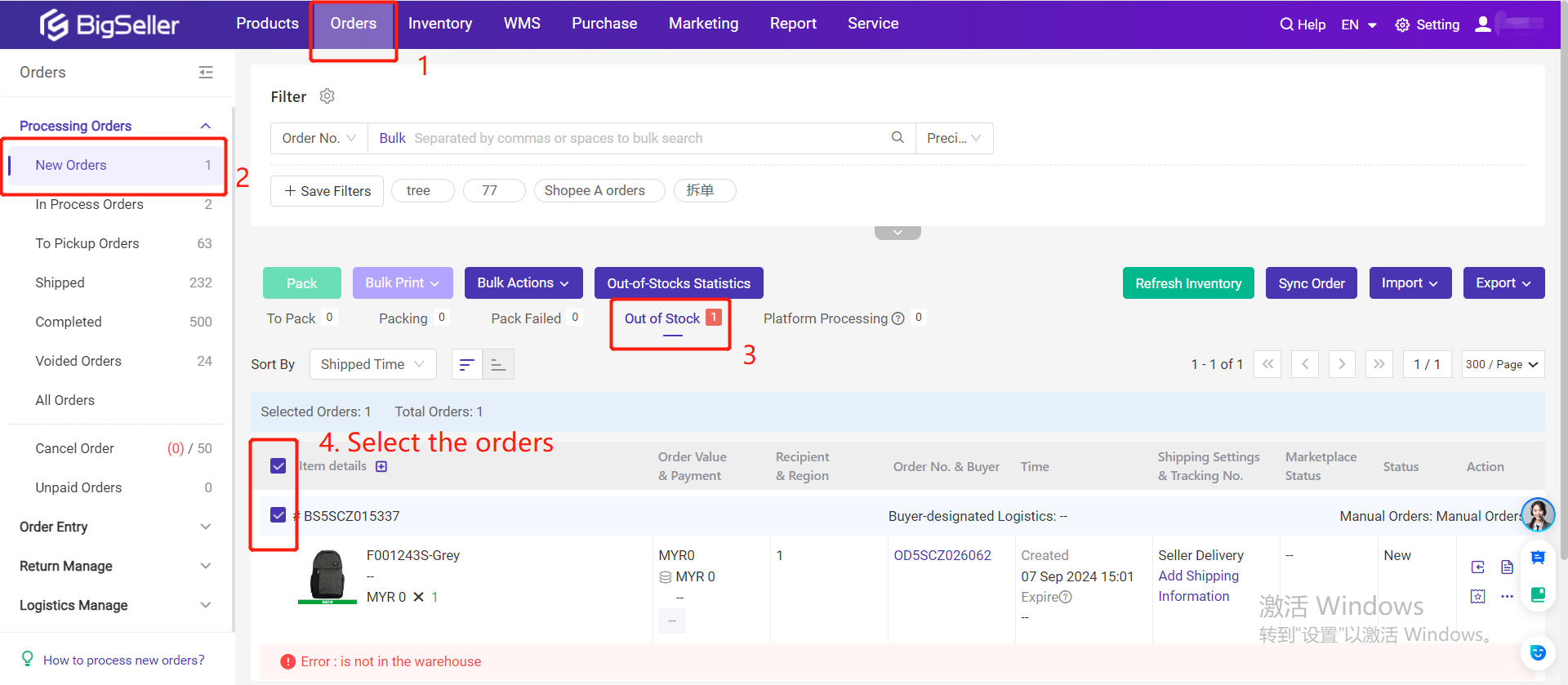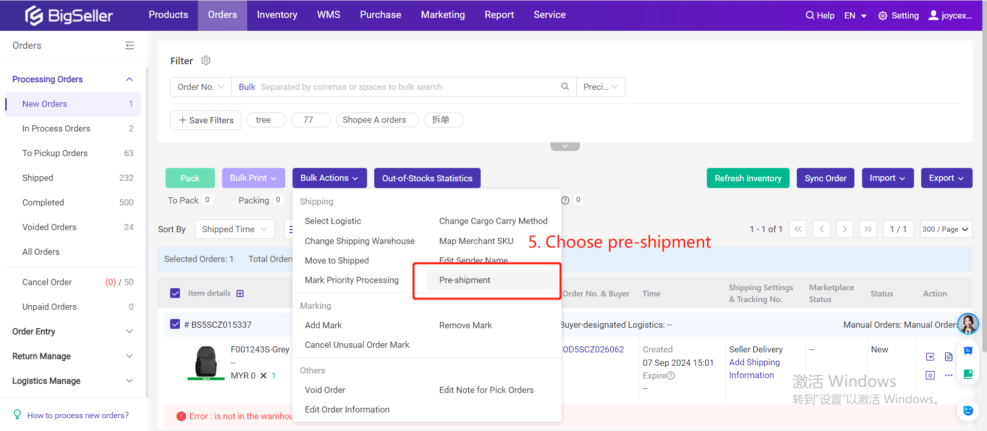 (2) Pre- Shipment: After the order is marked as pre-shipped, the order status in seller center will be converted to "Processed", preventing the order from being cancelled by marketplace. For this order in BigSeller, you need to purchase and stock in as soon as possible so as to prepare the package in time.