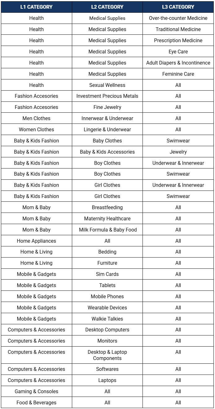 Below is a detailed list of products that are not eligible for COD Unbox: Return on the Spot: