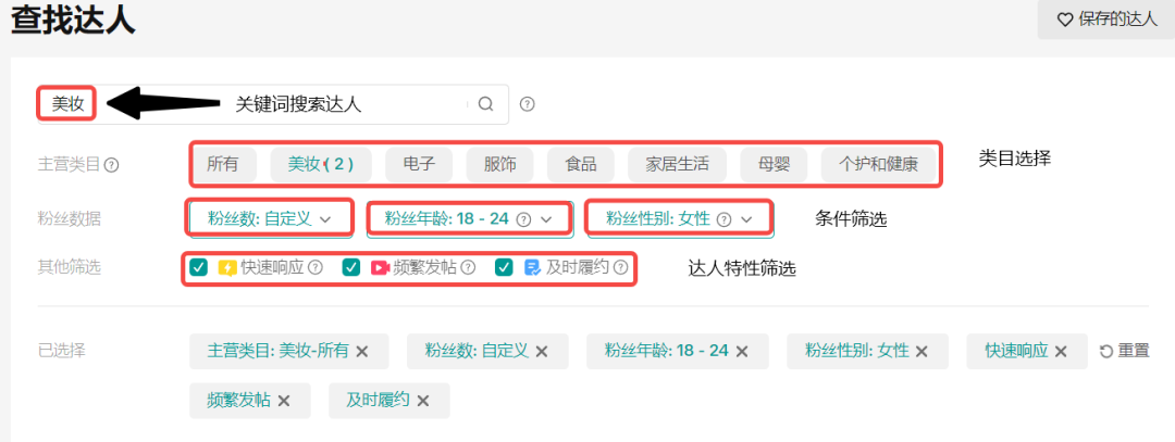 查找达人可以通过主营类目、粉丝数据、其他筛选进行筛查。