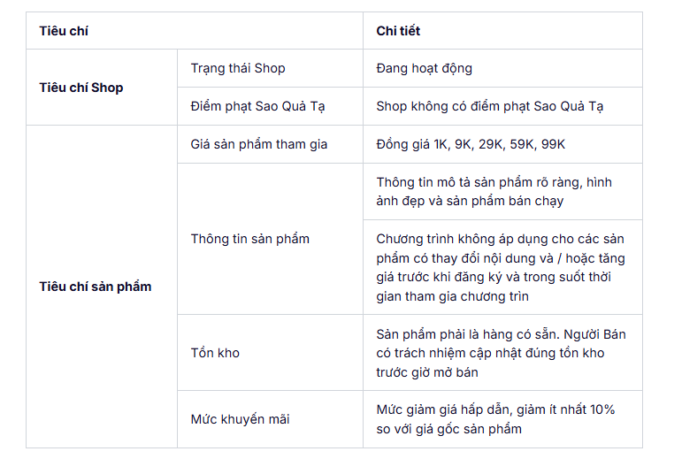 – Người Bán cần đáp ứng đủ các tiêu chí đề cập tại bảng trên tại thời điểm đăng ký tham gia và trong suốt thời gian diễn ra chương trình.