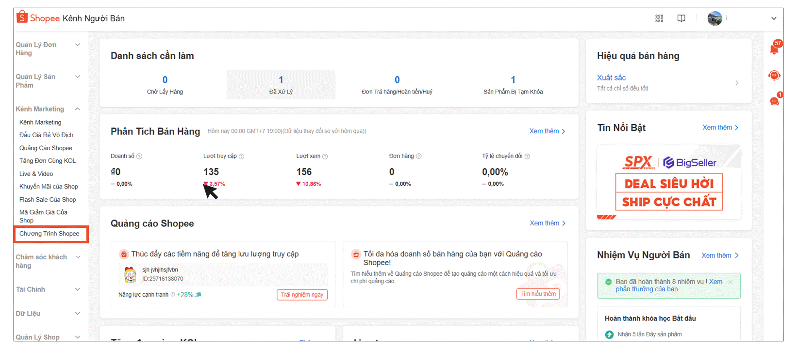 Bước 2: Tại trang Marketing, chọn mục Chương trình Shopee, trong mục Chương trình có thể tham gia và Thư Mời