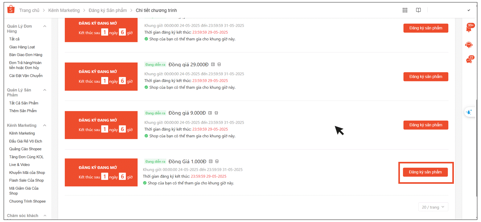 Bước 4: Tại mục Khung Giờ sẽ hiển thị các chương trình có thể tham gia, bấm vào nút Đăng ký sản phẩm để đi tới giao diện đề cử sản phẩm