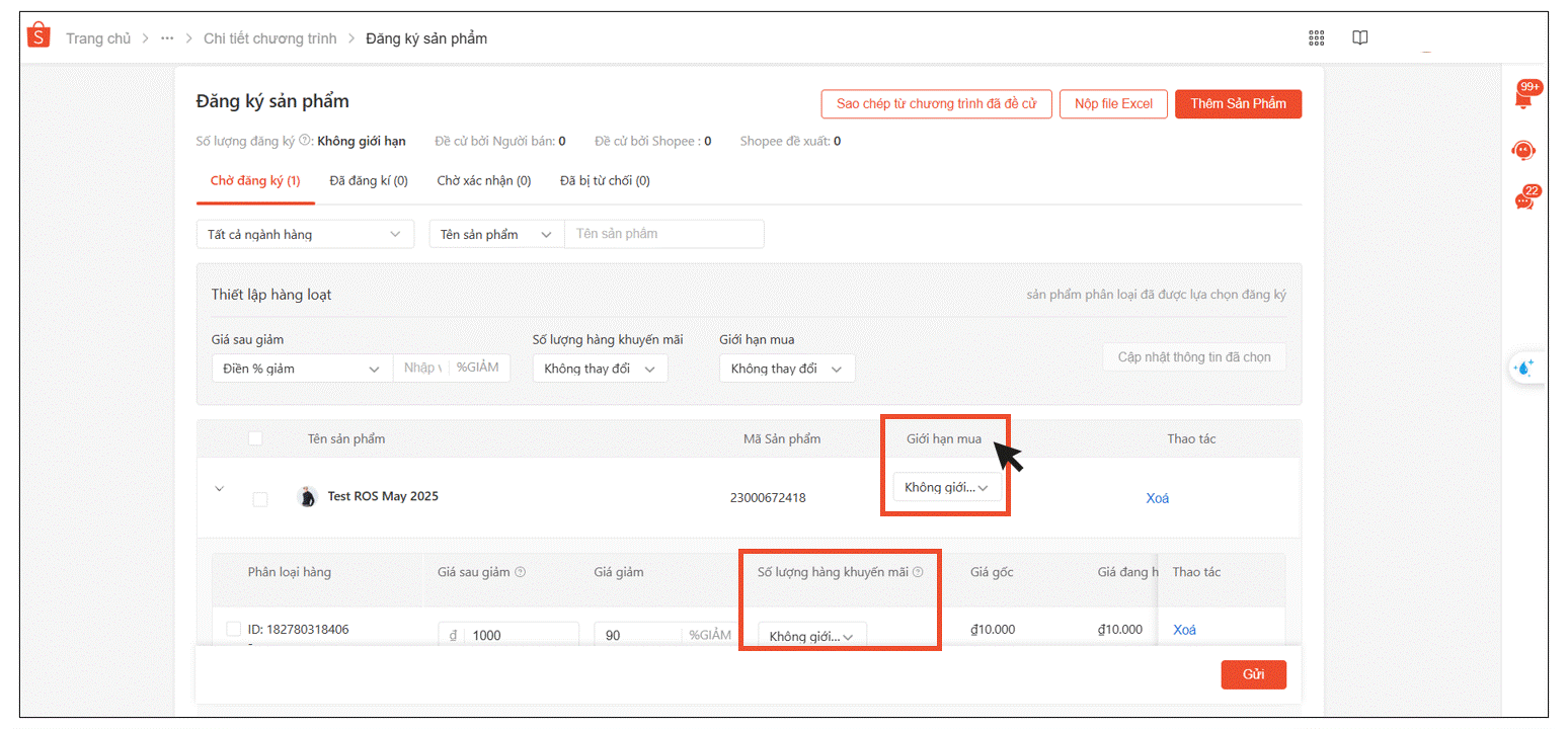 Bước 7: Đăng ký Giới hạn mua và Số lượng hàng khuyến mãi, có thể chọn Không giới hạn và Giới hạn