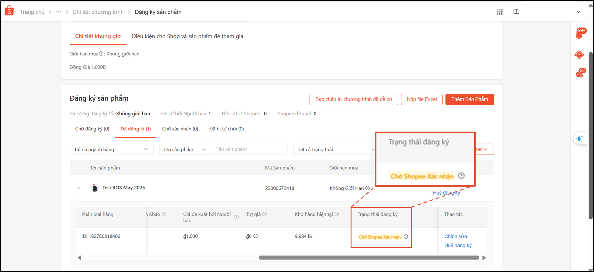 - Tại trang Đăng ký sản phẩm, trạng thái sẽ là “Chờ Shopee Xác nhận”
