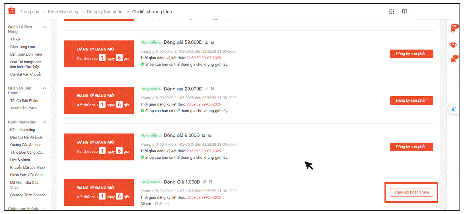 Lưu ý: Người Bán sẽ không thể Chỉnh sửa thông tin sản phẩm khi thời hạn đề của đã kết thúc (trong Giai đoạn xét duyệt hoặc trong Khung giờ chạy nếu sản phẩm của Shop đã được phê duyệt).