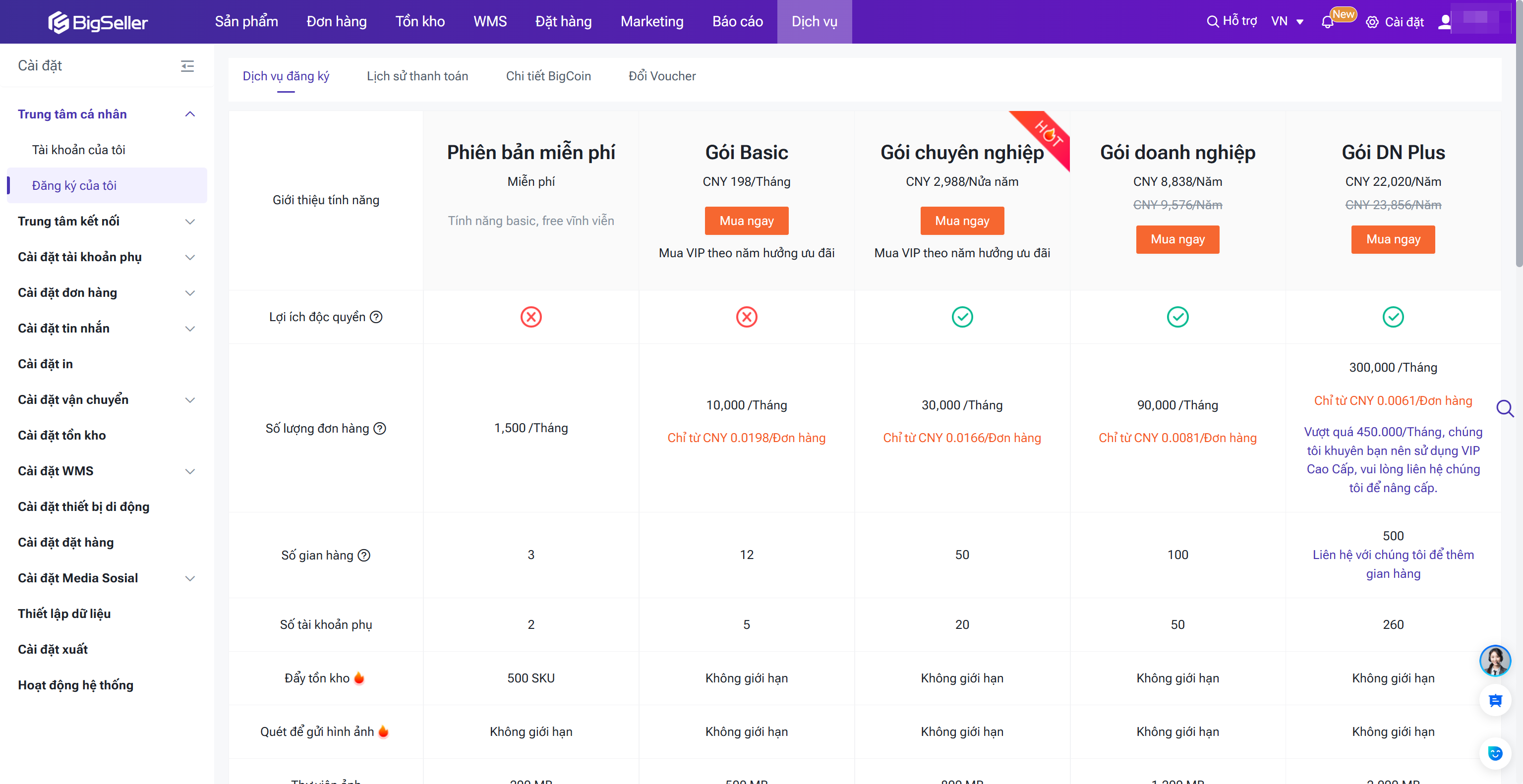 Bảng giá phần mềm quản lý bán hàng BigSeller phần mềm bán hàng tốt nhất hiện nay: