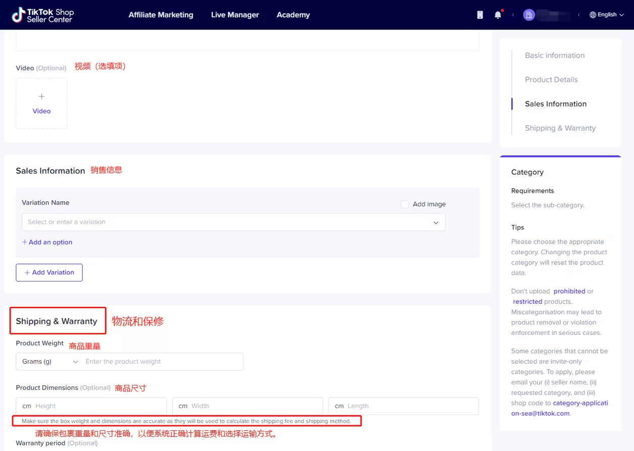 2、填写“商品名称”(需站点对应语种)、“商品类目”(注意:类目的选择一定要准确,不然会影响买家精准搜索到我们的商品);