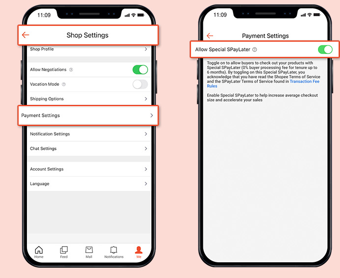 Also, you can go to Shopee APP > Me > My Shop > Shop Settings > Payment Settings, turn on the Allow Special SPayLater option.