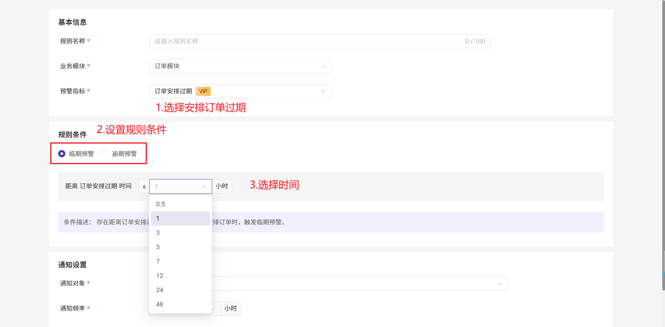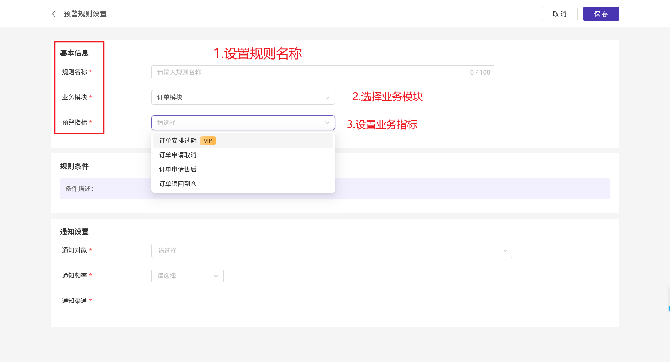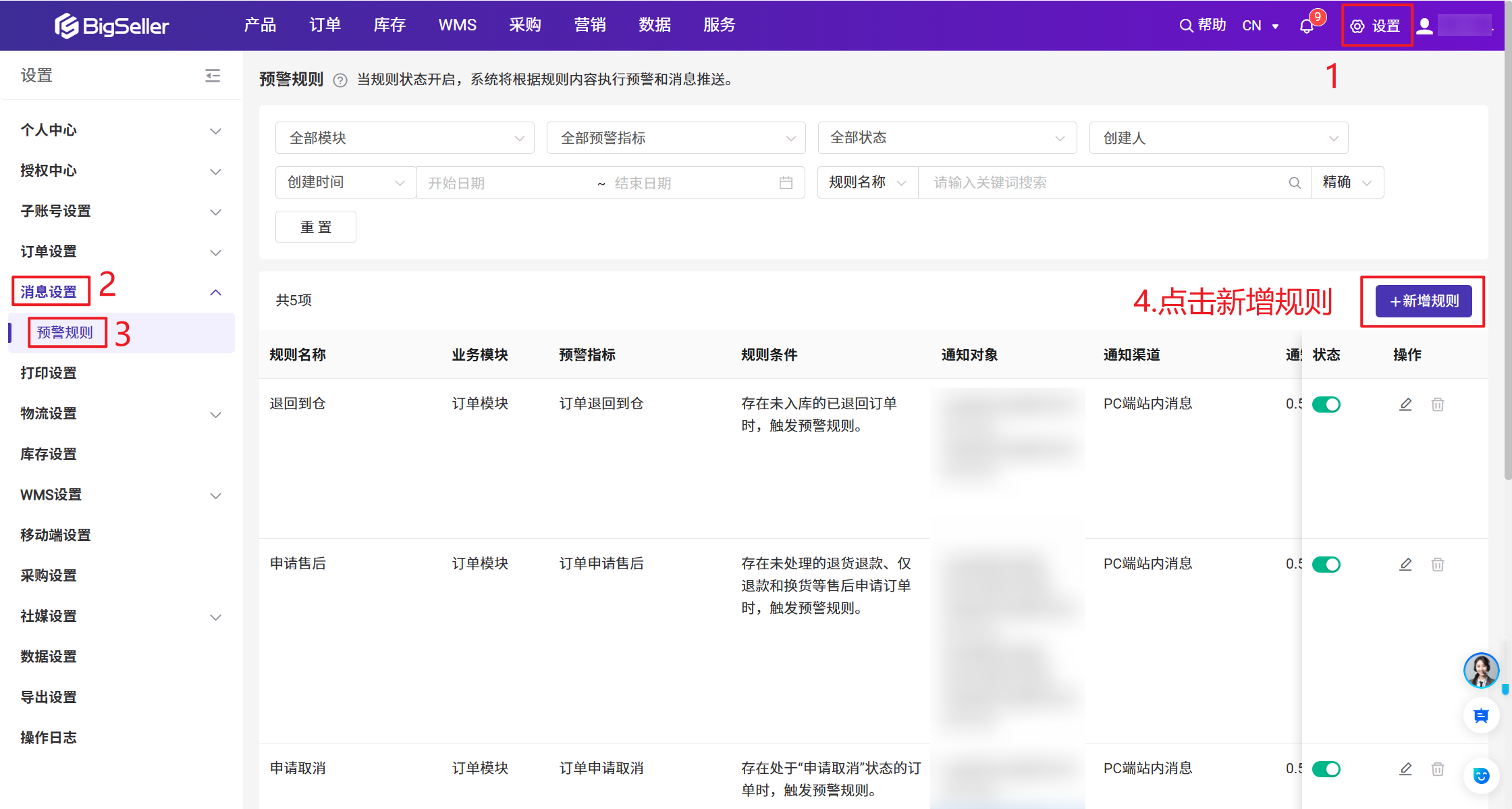 - 设置 > 消息设置 > 预警规则 > 点击新增规则
