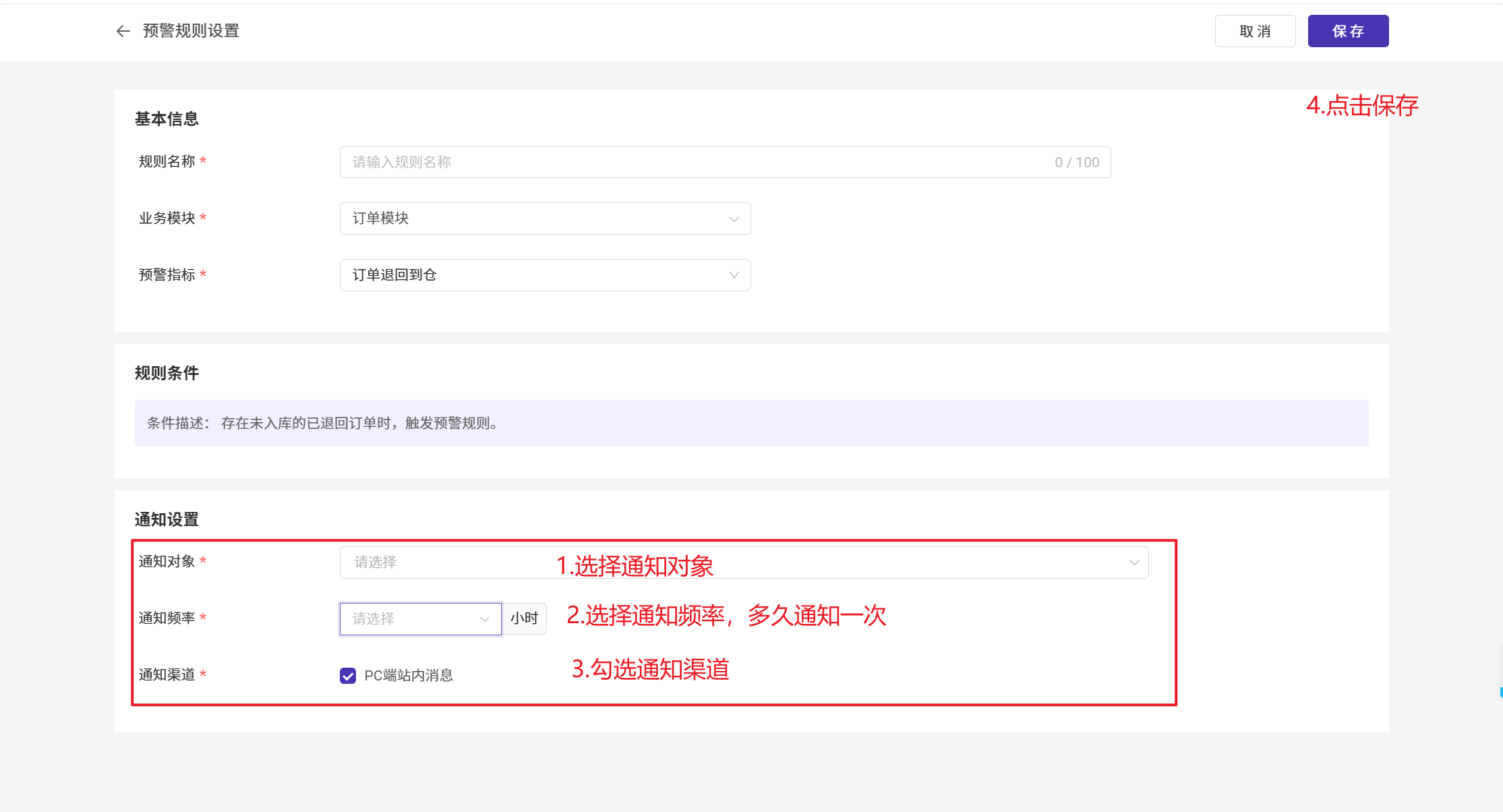 存在未入库的已退回订单时,触发预警规则。
