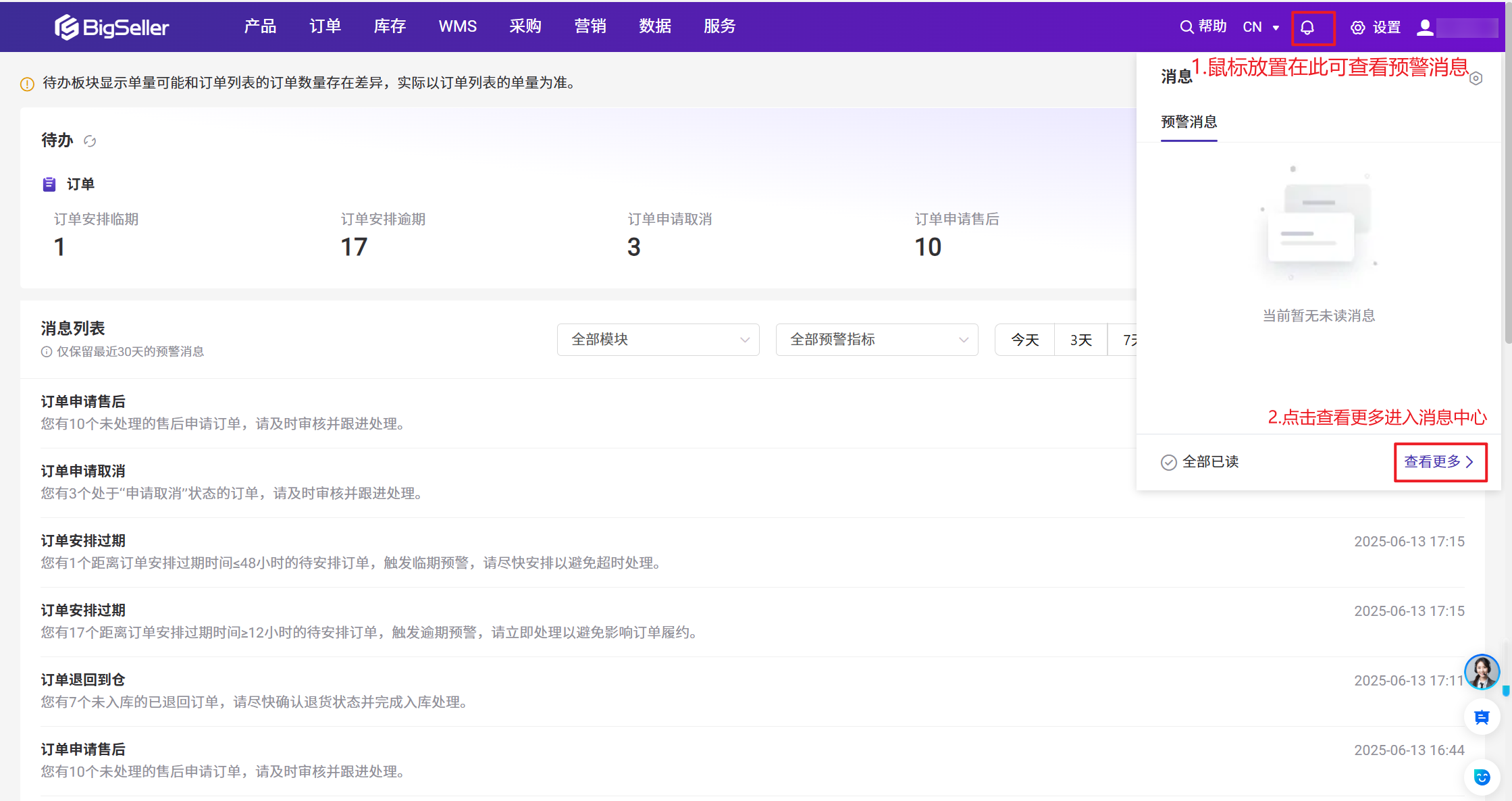 - 处理预警消息:鼠标点击消息中心即可进入消息列表
