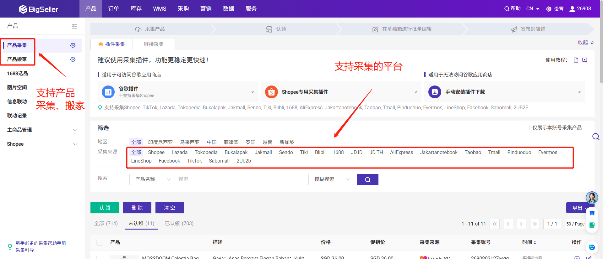 支持采集Shopee,TikTok,Lazada,淘宝,拼多多,天猫,1688的产品批量上架到TikTok店铺
