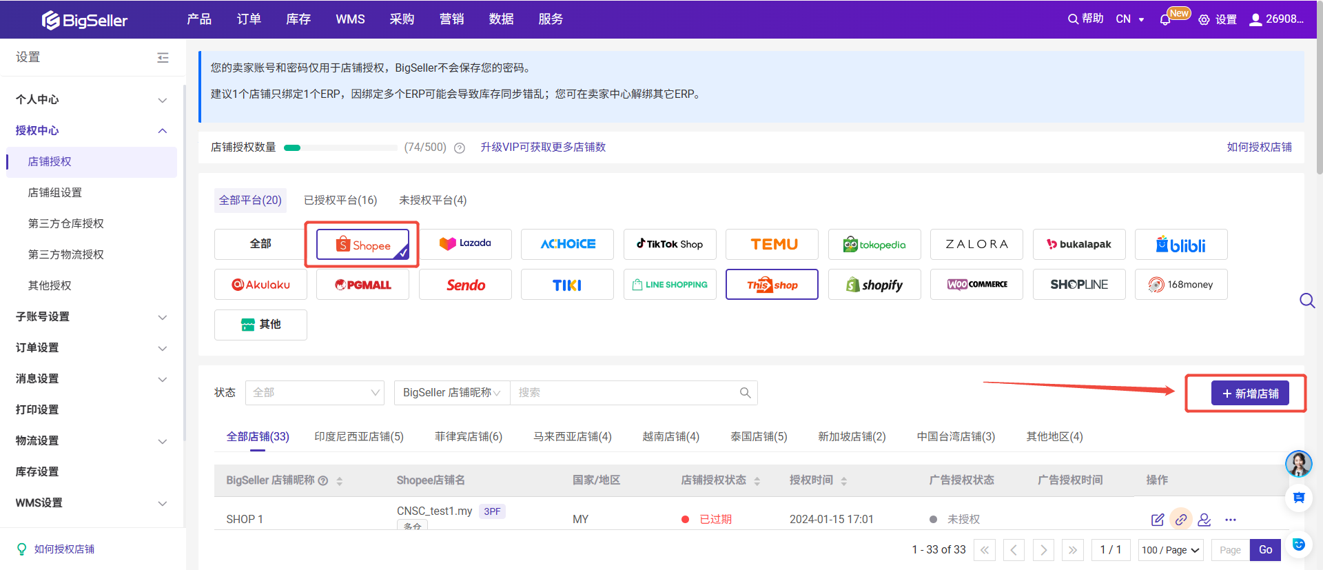 第一步:登录BigSeller,授权Shopee店铺到BigSeller