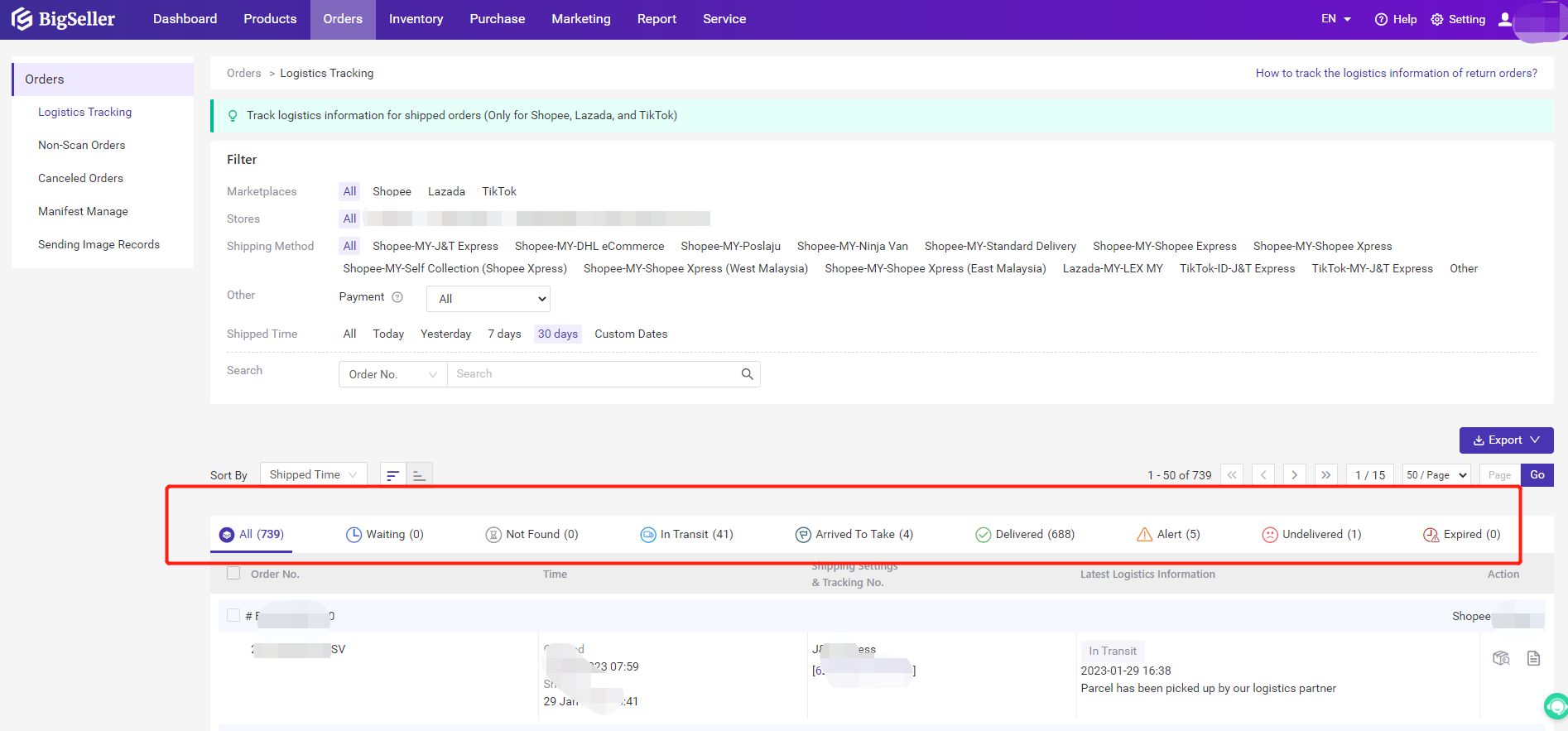 For sellers, you can keep track of your Shopee Express shipments on the My Shipment > Shipping page of the seller center or Shopee APP. Here you can see all shipped packages, you can filter the order time and check the shipping details.Another easier way is that you can use BigSeller to track all packages, and there are some parcel shipment status, for example, Not Found, In Transit, Delivered, Alert, Undelivered. With these statuses, you can check the abnormal packages easily. Then you can solve the package delivery issue immediately to avoid loss.