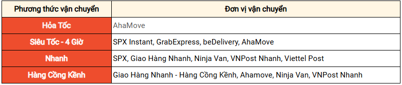 Tùy thuộc vào phương thức vận chuyển mà Người bán lựa chọn, đơn vị vận chuyển được phân bổ như sau: