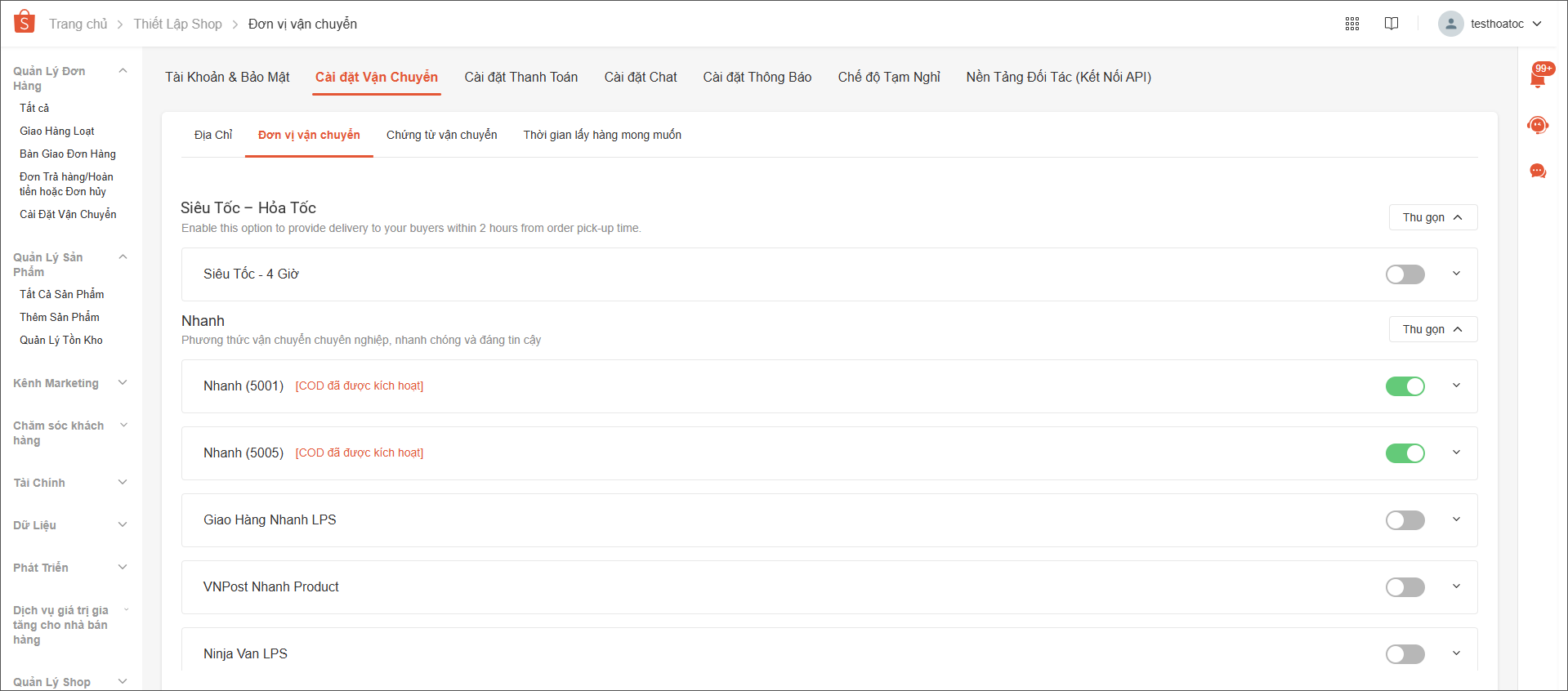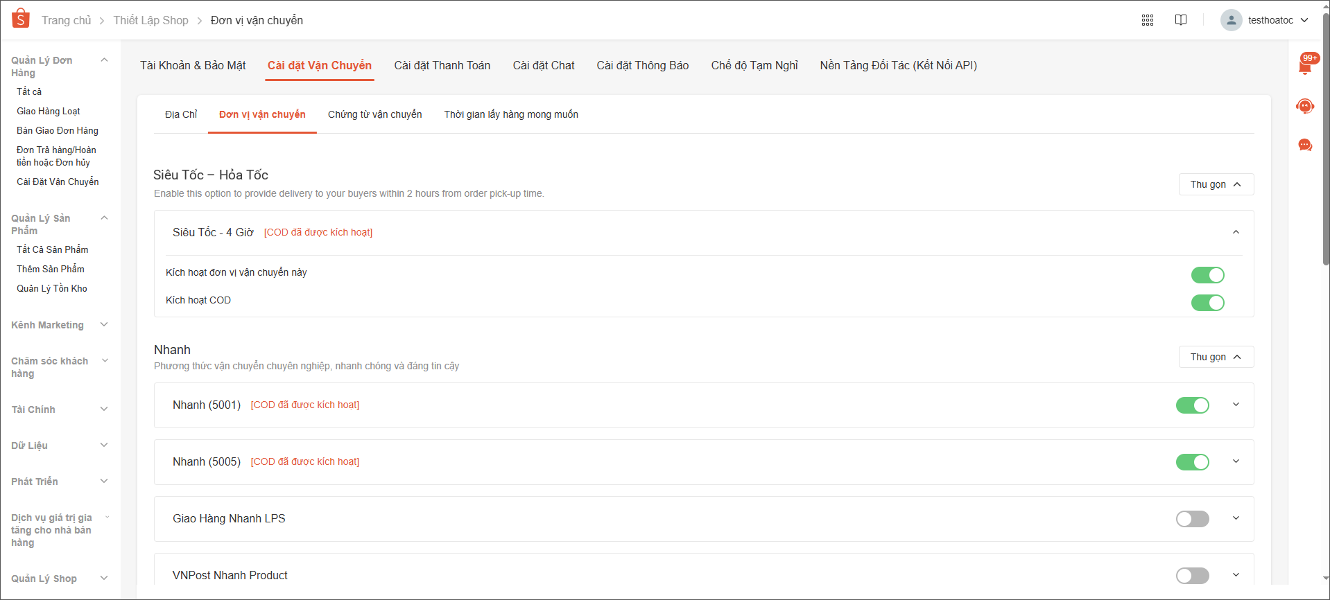 - Lựa chọn bật/tắt các phương thức vận chuyển: Hỏa Tốc, Siêu Tốc - 4 Giờ, Nhanh, Hàng Cồng Kềnh, Tủ nhận hàng cho Shop và cho từng sản phẩm;