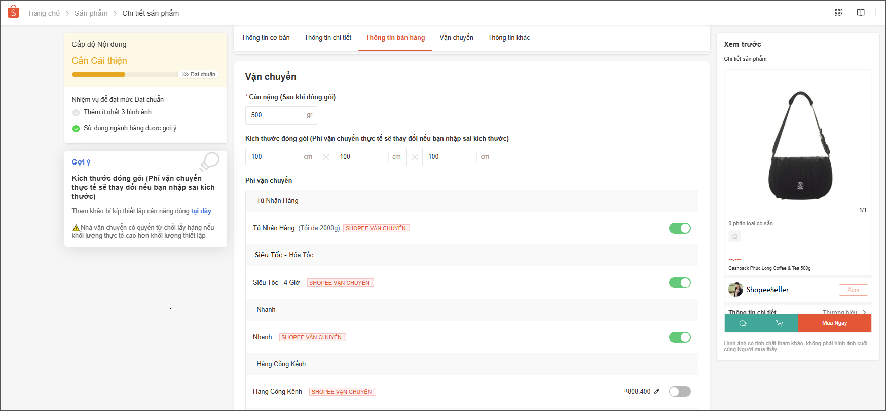 B. Hướng dẫn Cài đặt vận chuyển tại Kênh Người Bán và trang Sản Phẩm