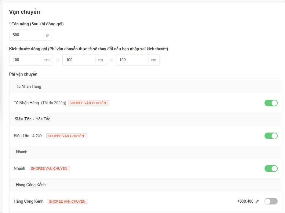 Đối với Người bán kinh doanh sản phẩm đặc thù, Người bán có thể bật/ tắt hình thức giao hàng này song song với các phương thức vận chuyển từ các đối tác vận chuyển trên sàn Shopee.