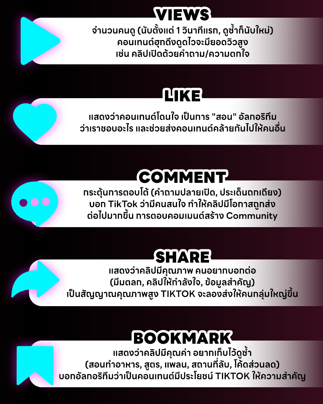 Comment (การแสดงความคิดเห็น) : คลิปของคุณกระตุ้นให้เกิดการตอบโต้ เช่น คลิปที่ตั้งคำถามปลายเปิดตอนท้ายว่า "ทุกคนมีความเห็นว่ายังไงบ้างคะ?" หรือ "มีใครเคยเจอแบบนี้ไหม?" รวมถึงคอนเทนต์มีประเด็นถกเถียงเล็ก ๆ เพื่อให้คนเข้ามาแสดงความเห็น ที่ยังเป็นการส่งสัญญาณบอก TikTok ว่าคลิปนี้มีคนสนใจในระดับที่สูงกว่ายอดไลก์ ทำให้มีแนวโน้มสูงมากยิ่งขึ้นที่คลิปจะถูกส่งไปยังฟีดของคนอื่น
