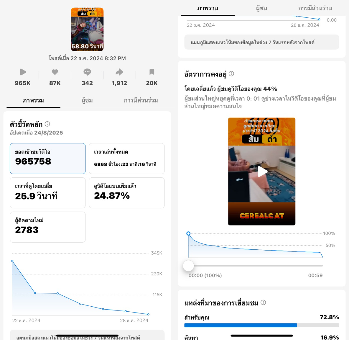 - เวลาดูโดยเฉลี่ย (Average Watch Time) : คือค่าเฉลี่ยของเวลาที่ผู้ชมหนึ่งคนใช้ในการดูคลิปของคุณ และนี่คือ "ตัวเลขที่สำคัญที่สุด" ที่คุณต้องดู เป็นสัญญาณที่ชัดเจนที่สุดที่บอกอัลกอริทึมว่าคอนเทนต์ของคุณมีคุณภาพและดึงดูดคนได้ดีแค่ไหน เช่น คลิปยาว 15 วินาที ที่มีคนดูเฉลี่ย 13 วินาที มีคุณค่าในสายตาอัลกอริทึมมากกว่าคลิปยาว 1 นาที ที่มีคนดูเฉลี่ยแค่ 5 วินาทีอย่างเทียบไม่ติด คอนเทนต์ที่ทำค่านี้ได้ดีมักจะมี "ฮุค" ที่แข็งแรงและมี "ไคลแม็กซ์" ที่น่าติดตามตอนท้าย