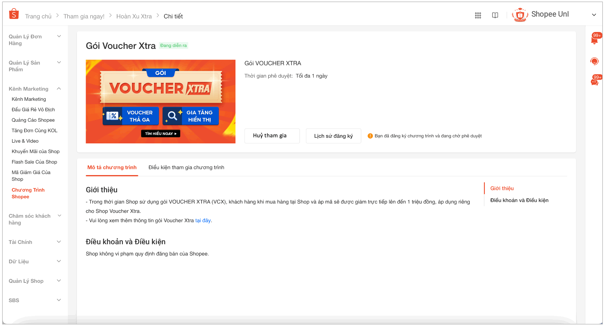 Hủy gói Voucher Xtra: Nếu muốn hủy gói voucher xtra trên Shopee, bạn cần thực hiện trong vòng 15 ngày kể từ ngày đăng ký thành công. Truy cập Kênh Marketing > Chương Trình Shopee > Tìm Gói Voucher Xtra, chọn Chi tiết > Hủy, xác nhận hủy và gửi biểu mẫu.