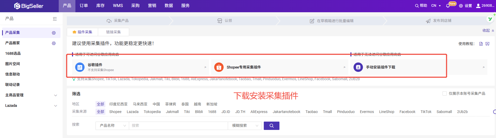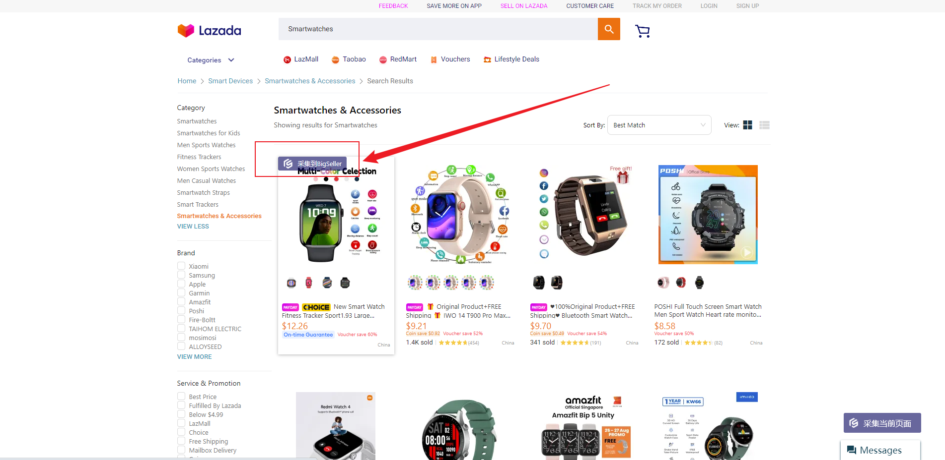 第二步:(以Lazada为例) 打开Lazada页面,选择产品,将鼠标移到产品上面,出现采集到BigSeller,点击鼠标即可