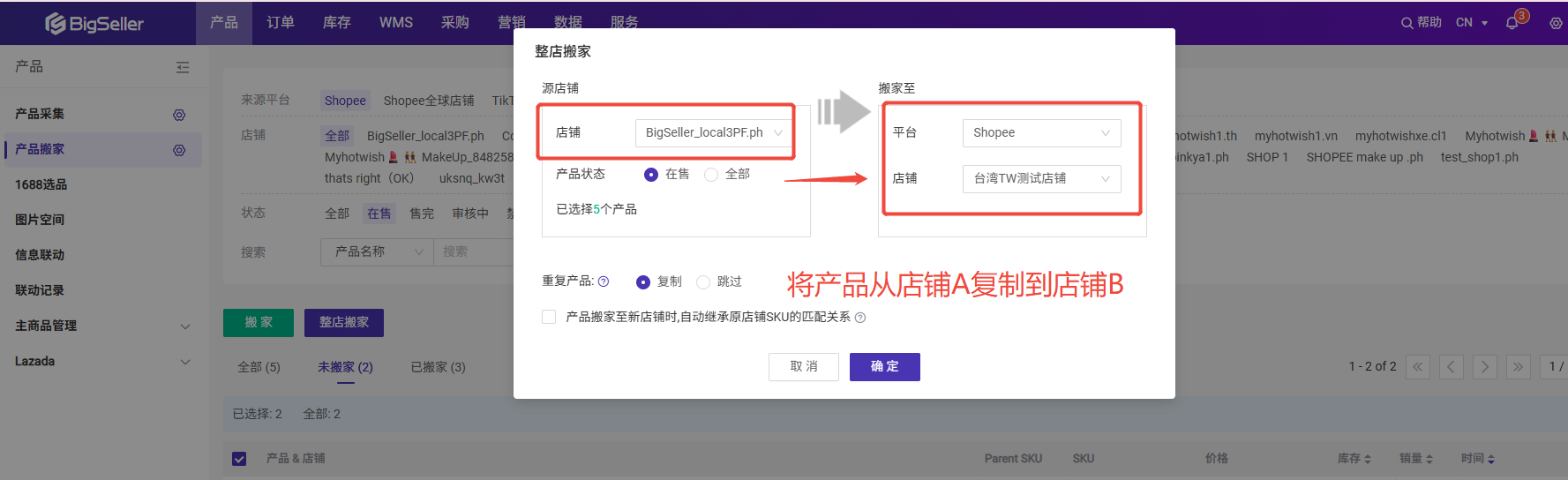 产品搬家:在拓展新站点,新平台时候,可以用搬家功能,快速将店铺A的产品复制上架到店铺B